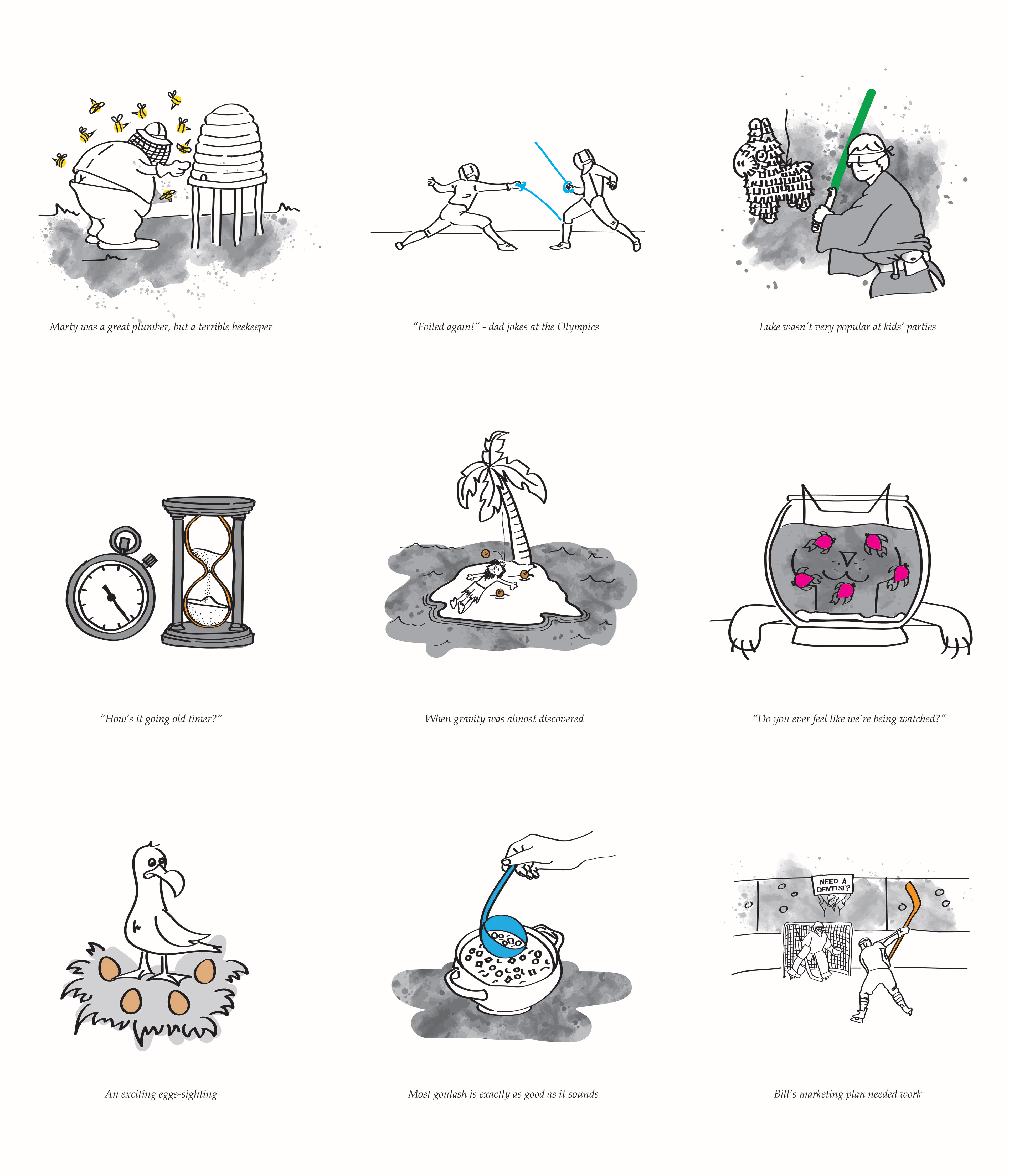 For an art studio based room, I was tasked with making a series of one panel comics in a style that resembles what you would find in the New York Times. Each image had to have a secret number either hidden in it or implied by it. These numbers were then used to solve a large puzzle within the room.
